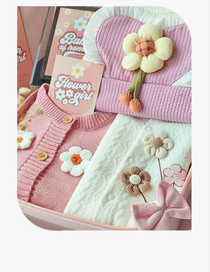 Adorable pink princess-themed gift box for baby girls – perfect for spring, fall, and winter. Includes soft, comfortable cotton items for infants.