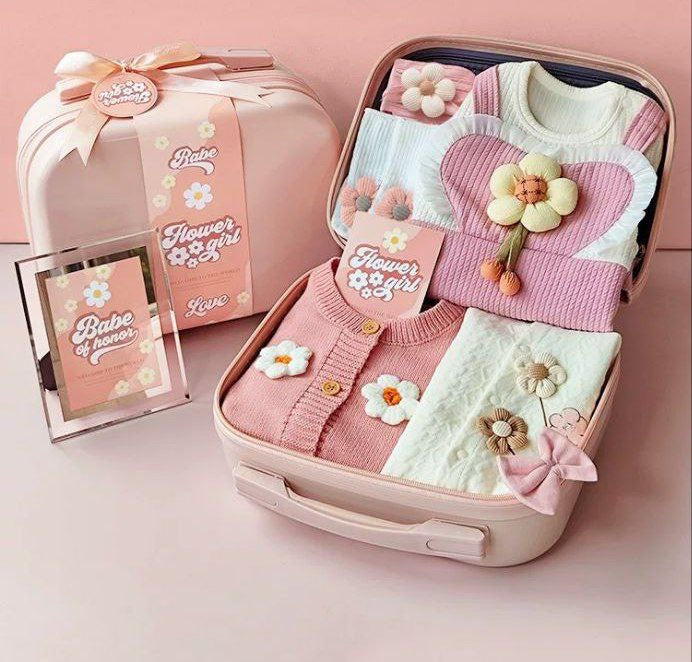 Rosa Geschenkbox im Prinzessinnenstil für kleine Mädchen – ideal für Frühling, Herbst und Winter. Enthält weiche, bequeme Baumwollkleidung für Babys.