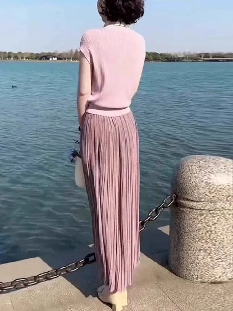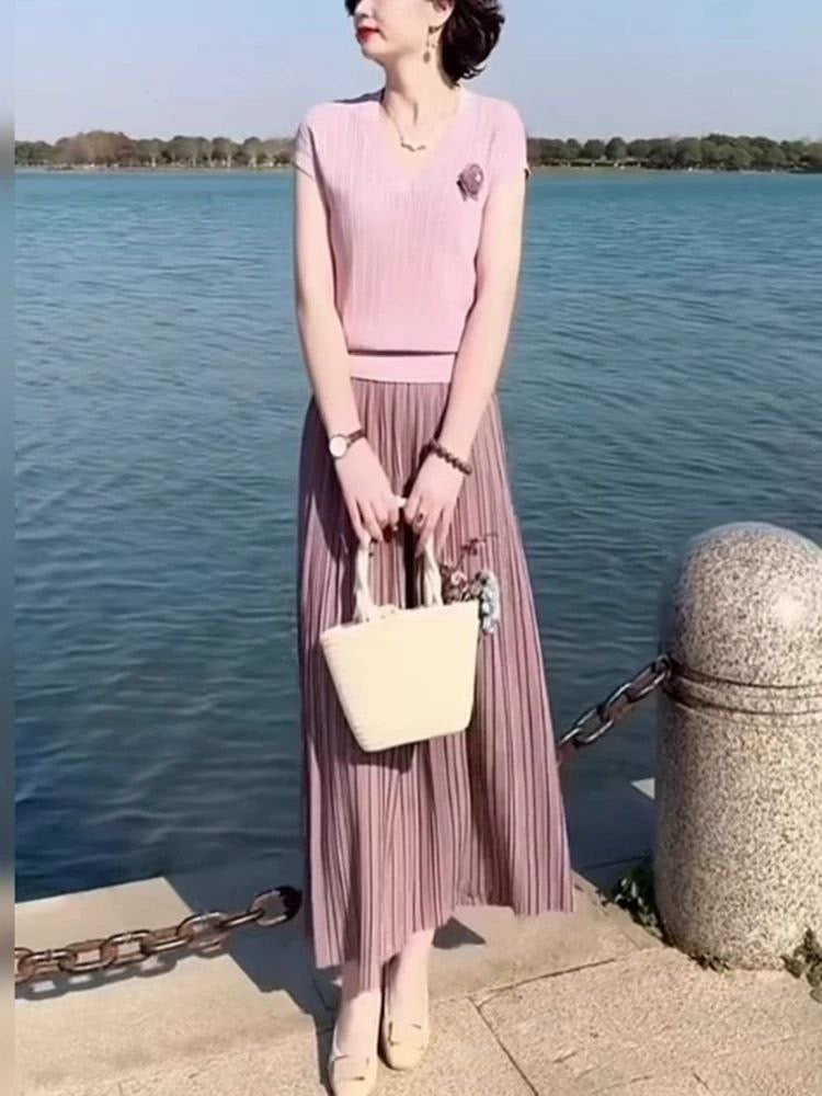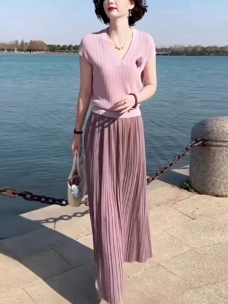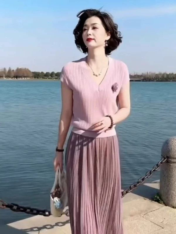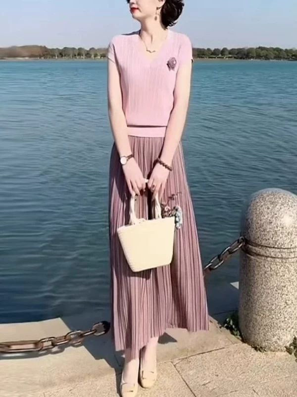 Pleated Maxi Skirt with V-Neck Elegant Summer Skirt for Moms Slimming Two-Piece Set
