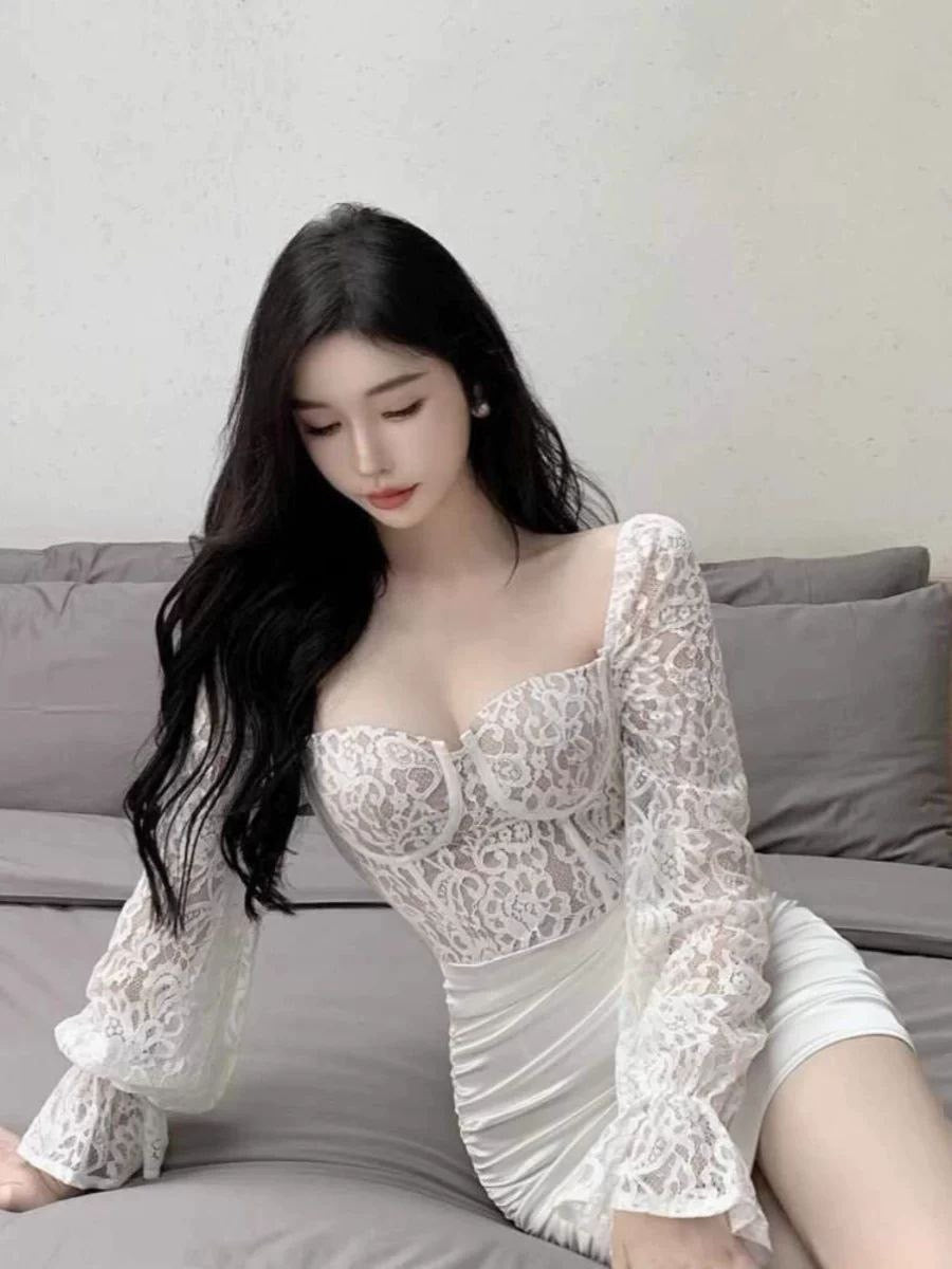Celebrity-style plus size lace dress for women weighing up to 300 lbs. Features a sexy French hemline, long sleeves, and a tight short skirt.