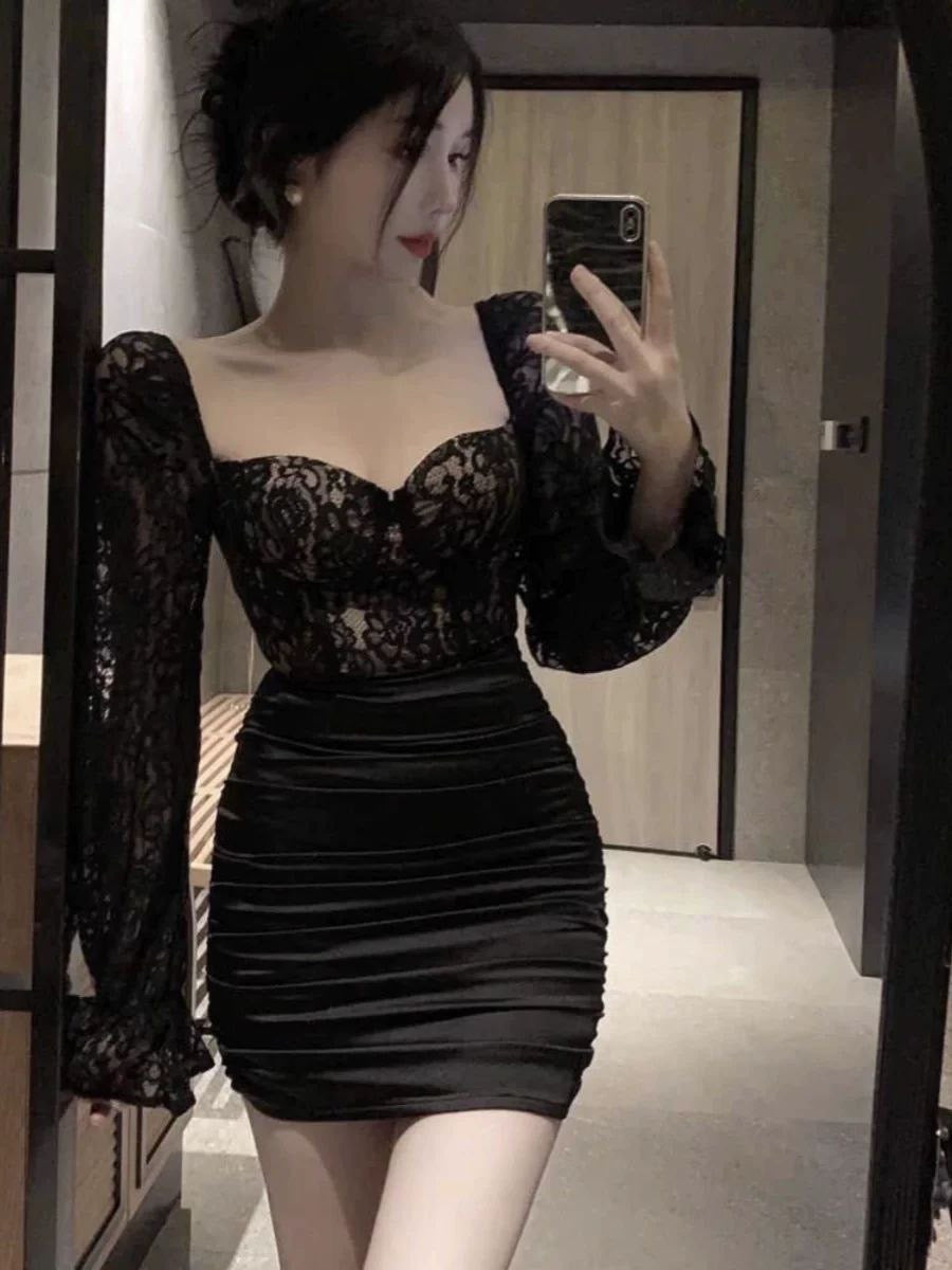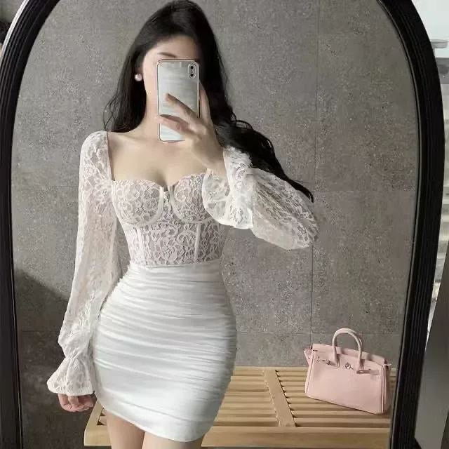 فستان دانتيل المشاهير بمقاس كبير للنساء بوزن 300 رطل، تنورة فرنسية مثيرة من الأسفل، بأكمام طويلة، تنورة قصيرة ضيقة