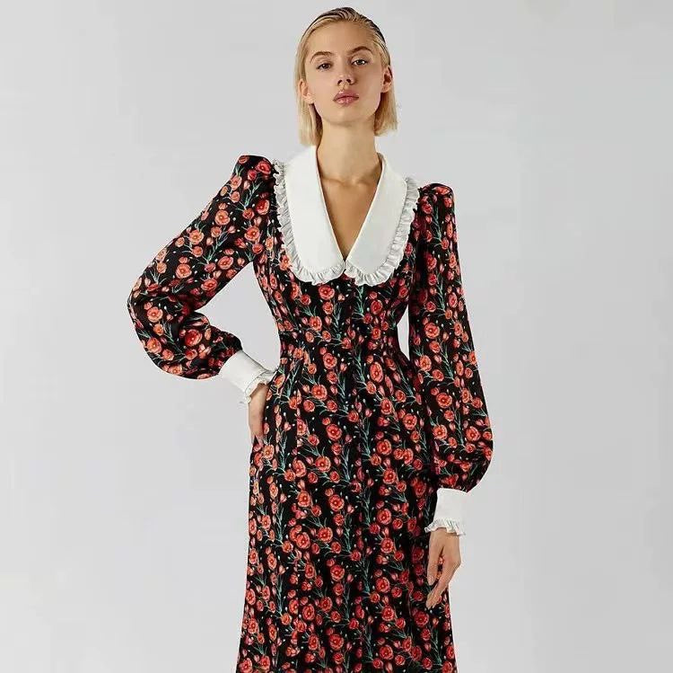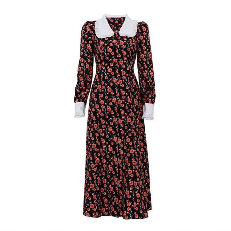 Printed Dress with Doll Collar & Mood-Style Waist – European & American Inspired