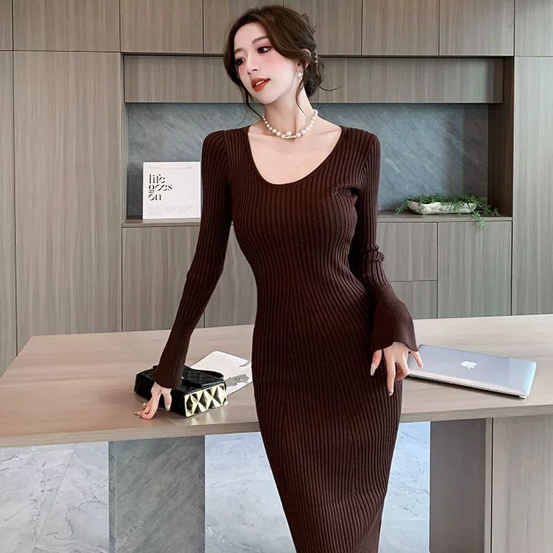 فستان محبوك بأكمام طويلة ورقبة مربعة حمراء بأكمام بوق