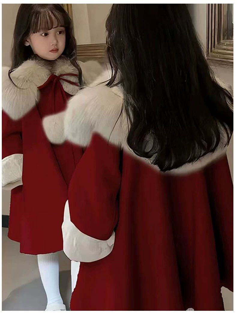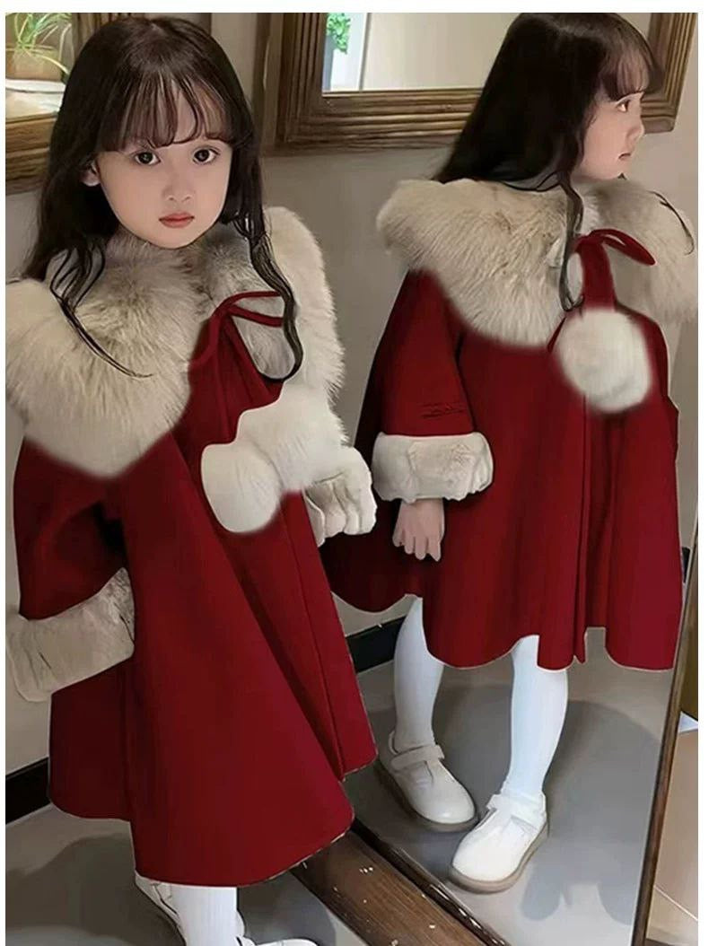 معطف خريف وشتاء أنيق للفتيات مصنوع من المخمل الأحمر مع عباءة صغيرة، مثالي لحفلات رأس السنة والمناسبات العائلية.
