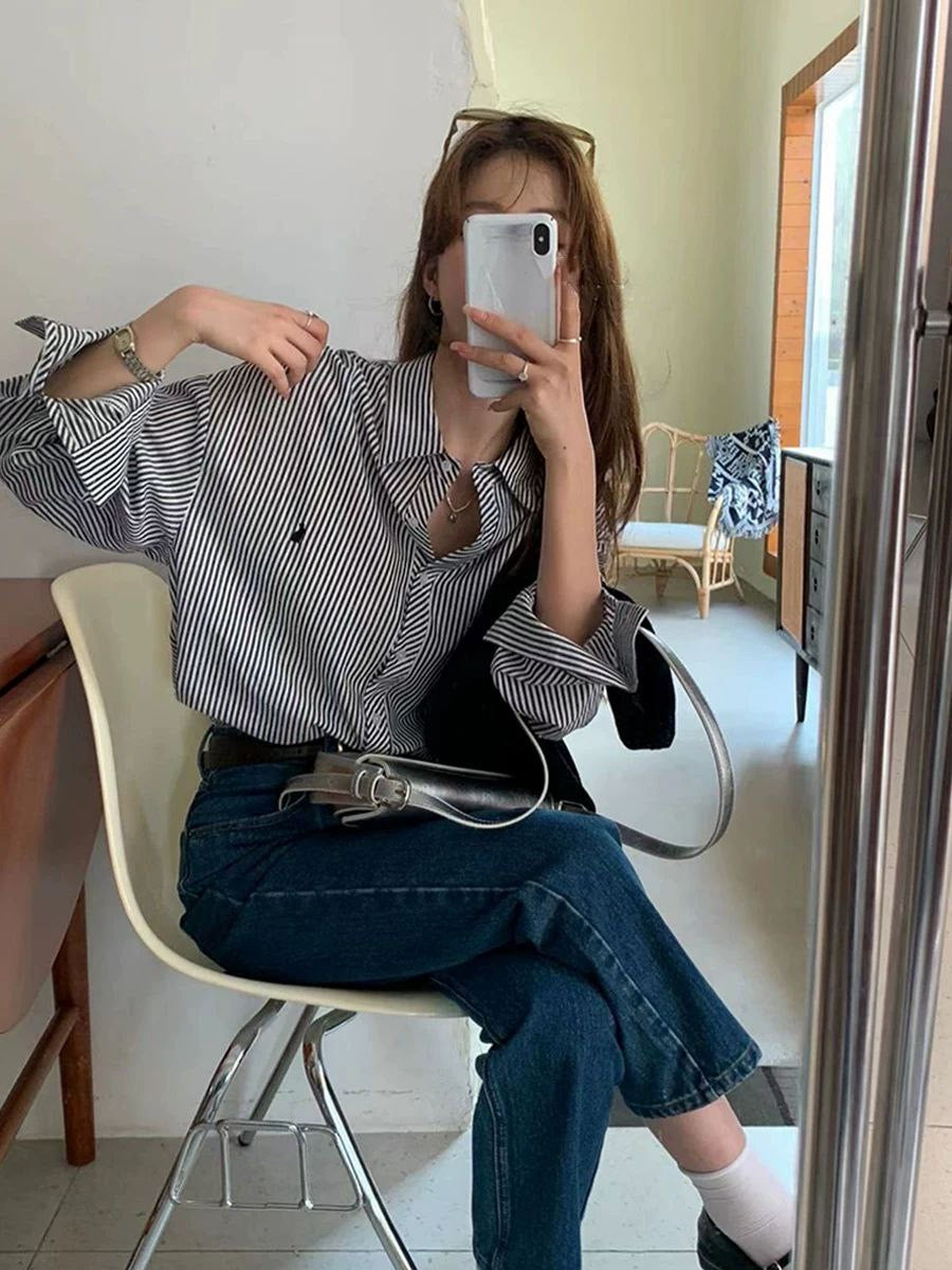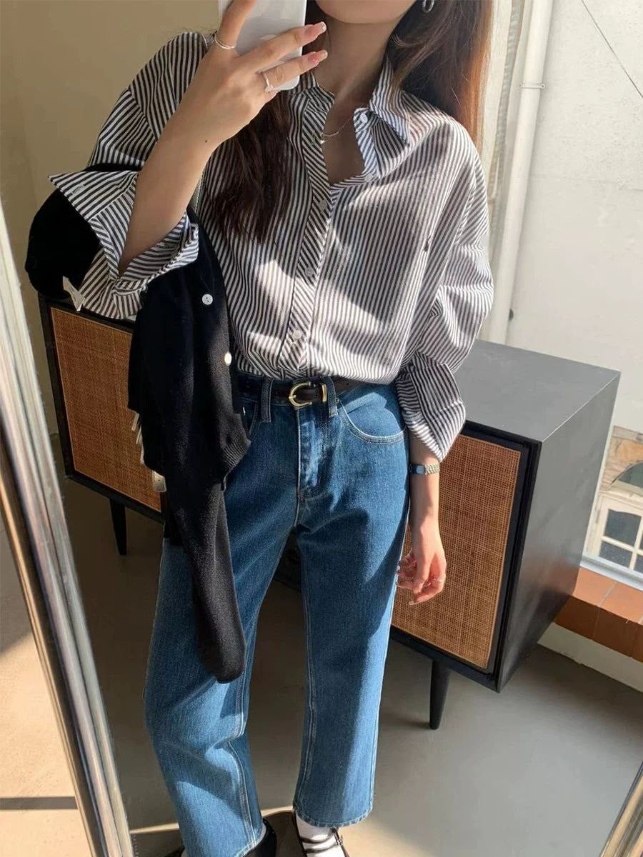 Long Sleeves, Layered Inner Striped Black Fabric, High-Quality French Style