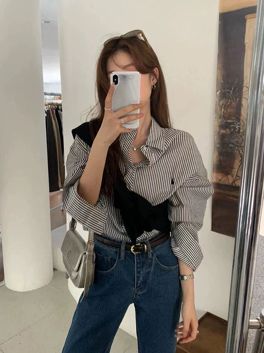 بأكمام طويلة وقميص داخلي متعدد الطبقات من القماش الأسود المخطط ذو الطراز الفرنسي عالي الجودة