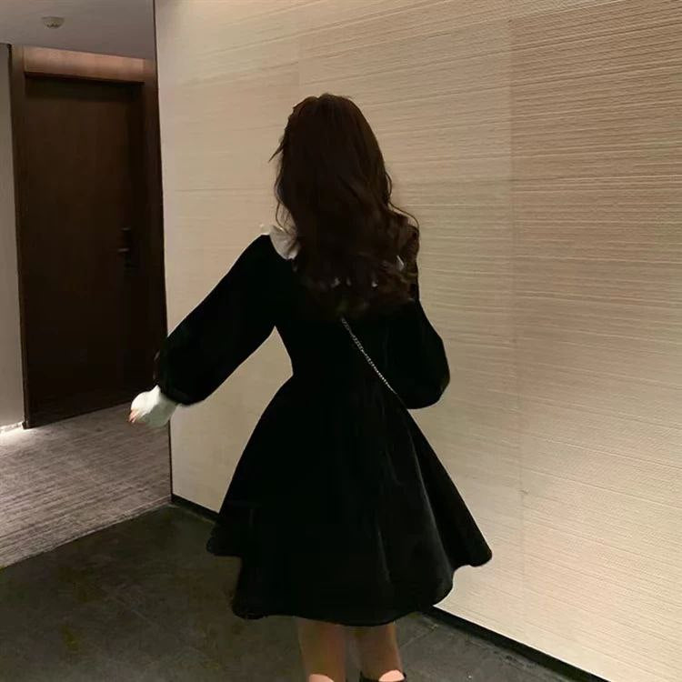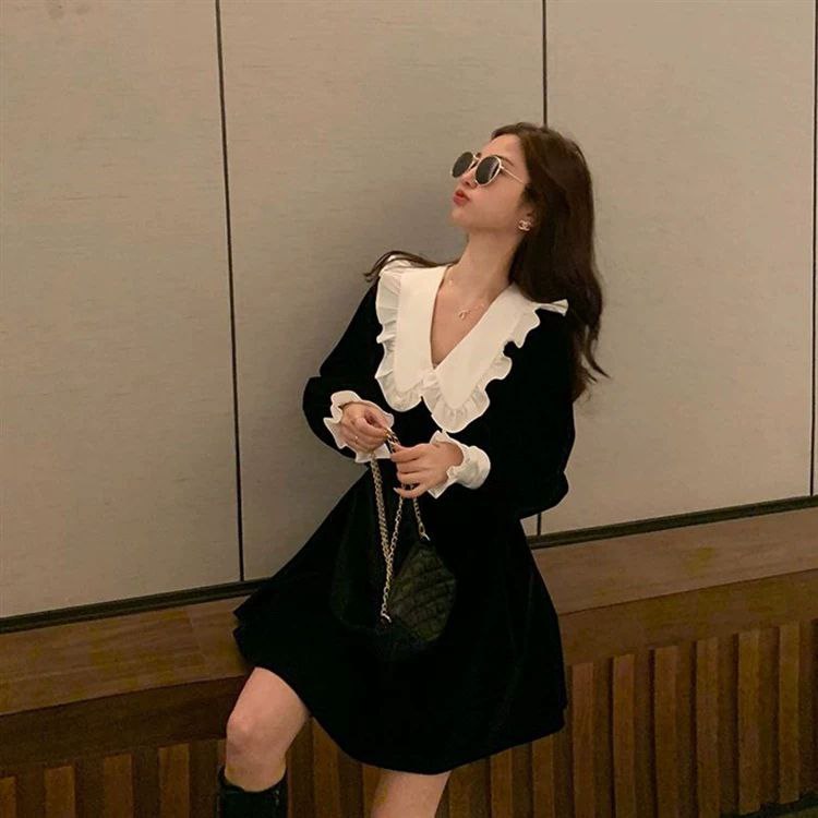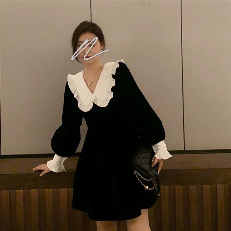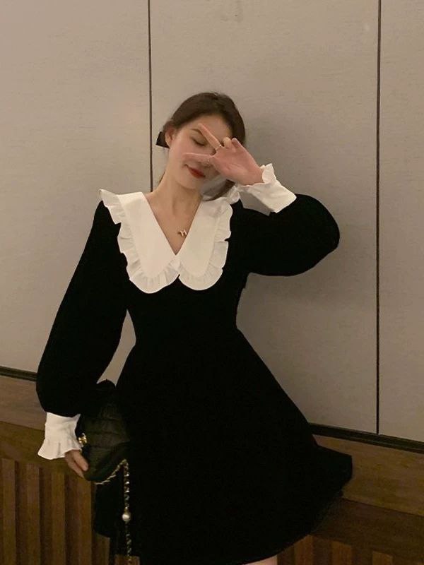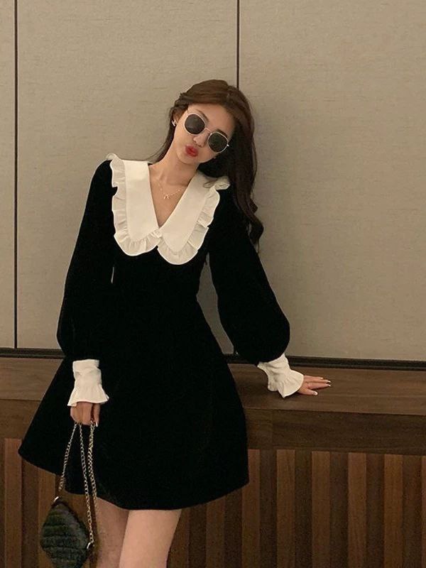 فستان مخملي بياقة دمية بألوان متباينة وتصميم لطيف ومكشكش للربيع والخريف، مع خصر جديد وتنورة A-line بأكمام طويلة لتنحيف الجسم.