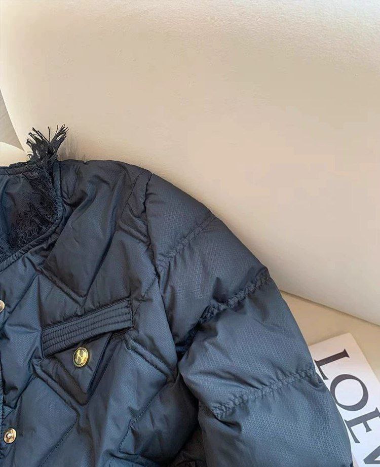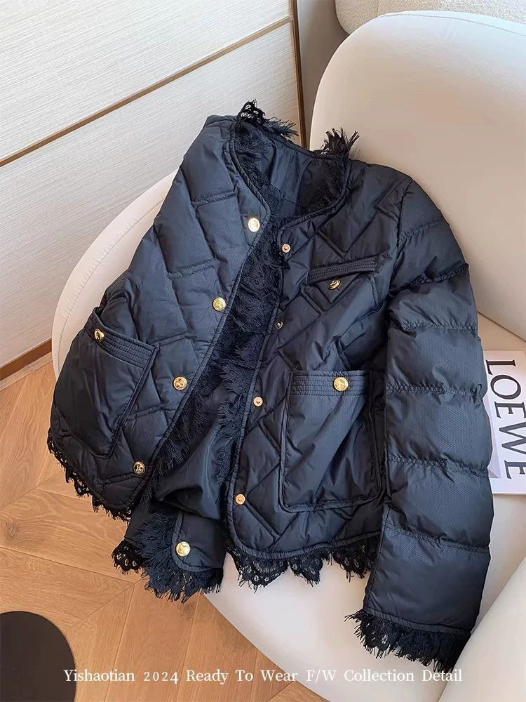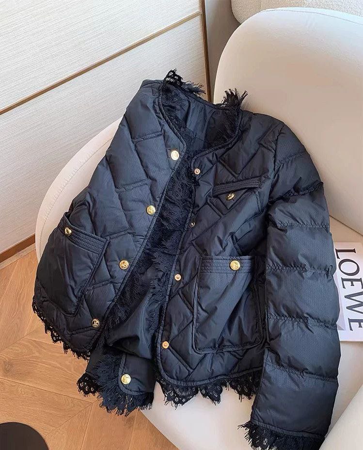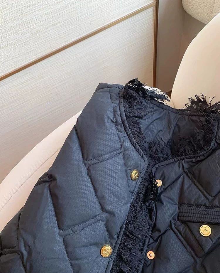 سترة دافئة وأنيقة لشتاء 2024، مصنوعة من قطن عالي الجودة ومزينة بخياطة الدانتيل الفرنسي الأسود. تصميم بسيط يضفي لمسة فاخرة على إطلالتك.