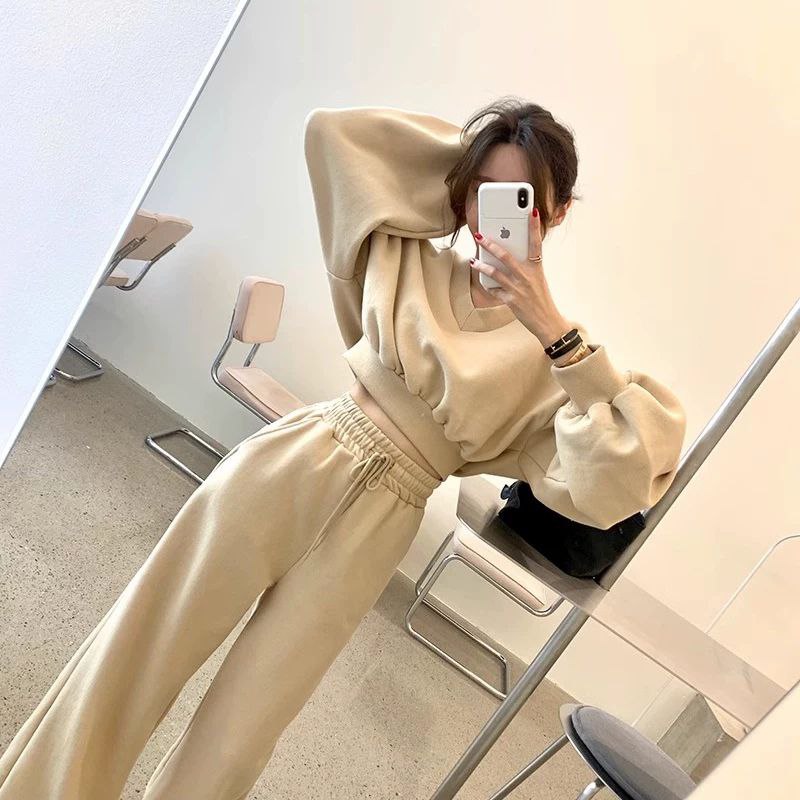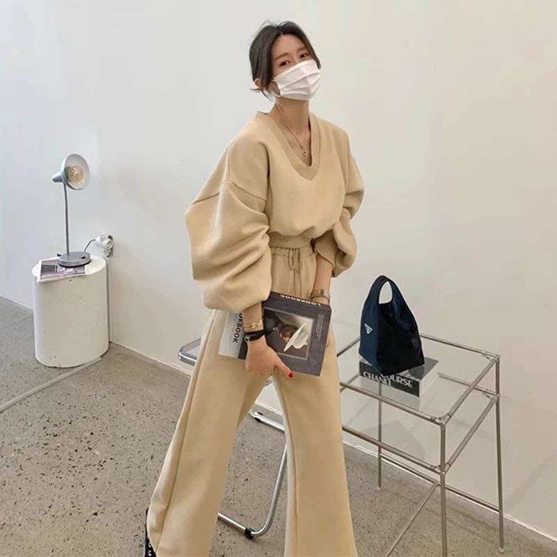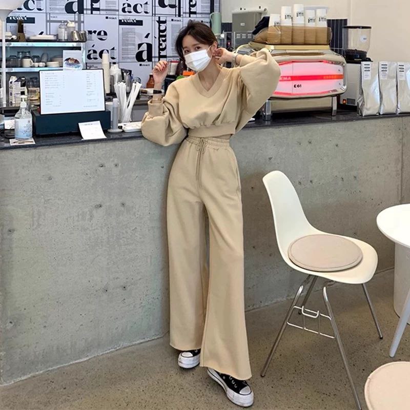 This chic Korean-style two-piece set for women is perfect for autumn and winter. It features a short velvet top with a flattering V-neckline and wide-leg trousers with a high waist, creating a stylish, comfortable, and sophisticated outfit suitable for various occasions.