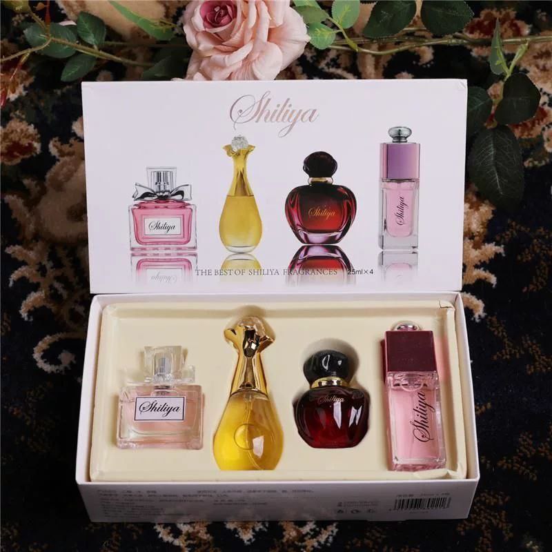 A premium women’s perfume gift set featuring 4 elegant fragrances (25ml each).