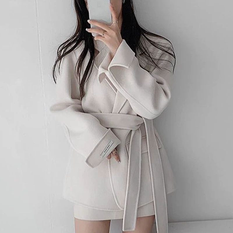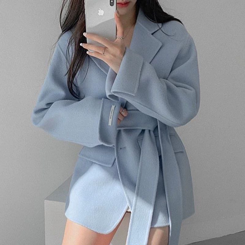 This elegant women’s slim wool coat features a Korean-inspired design perfect for autumn, with French flair details. The coat includes a stylish collar, functional pockets, and a waist tie for a flattering silhouette, making it both chic and practical for the season.