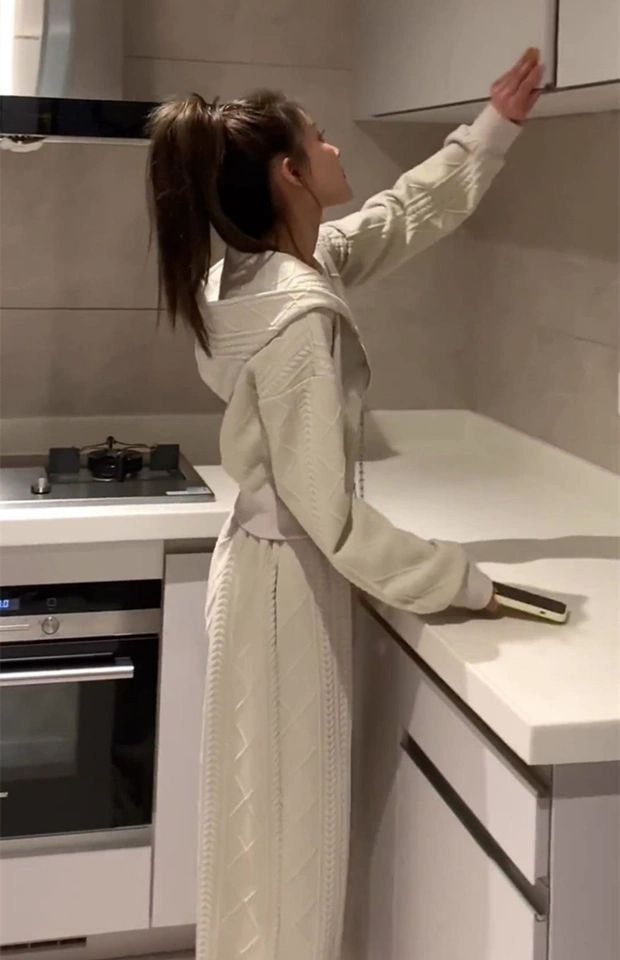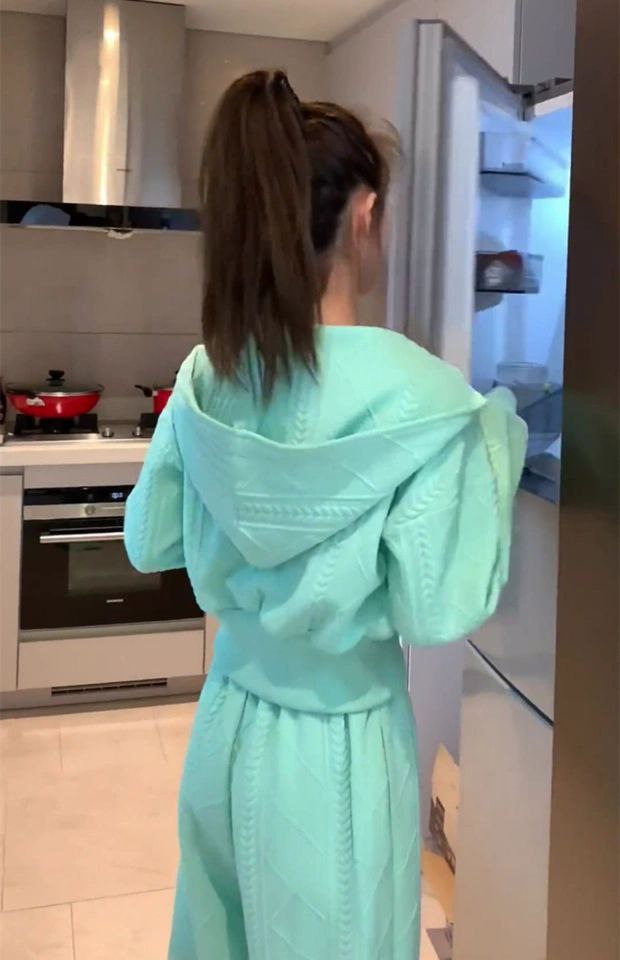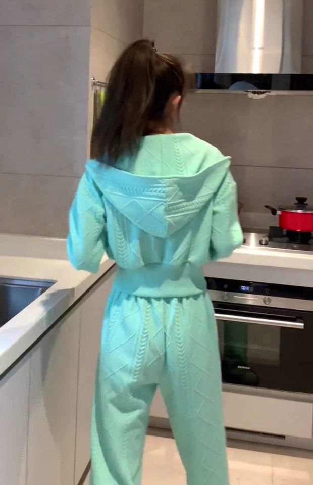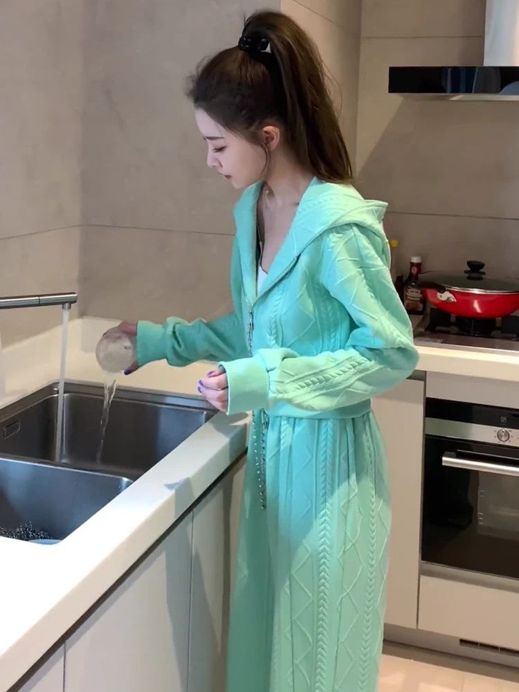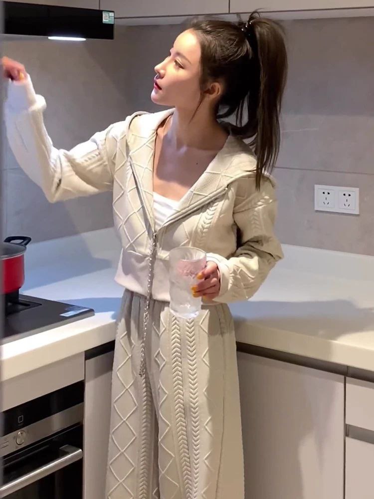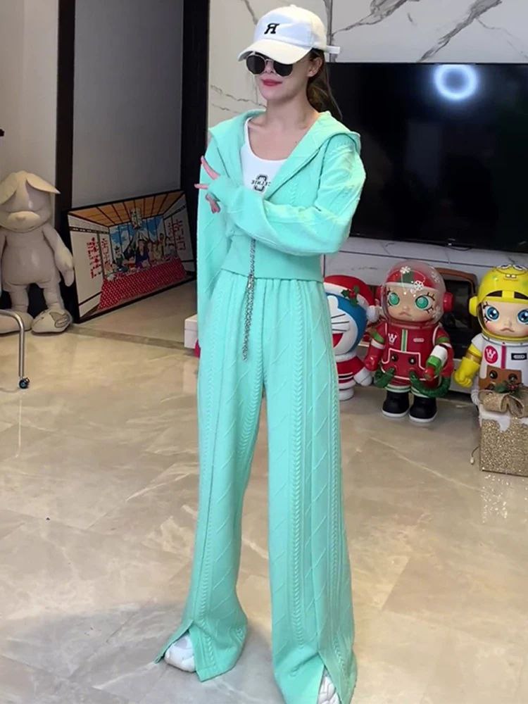 بدلة ربيعية أنيقة للسيدات تضم كارديجان فضفاض بغطاء للرأس وسويت شيرت مع بنطلون واسع الساق. مناسبة للمقاس الصغير (S).