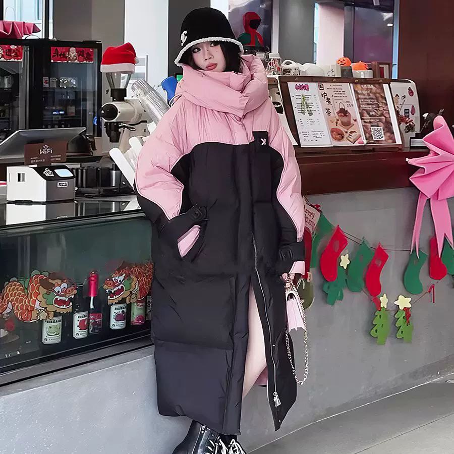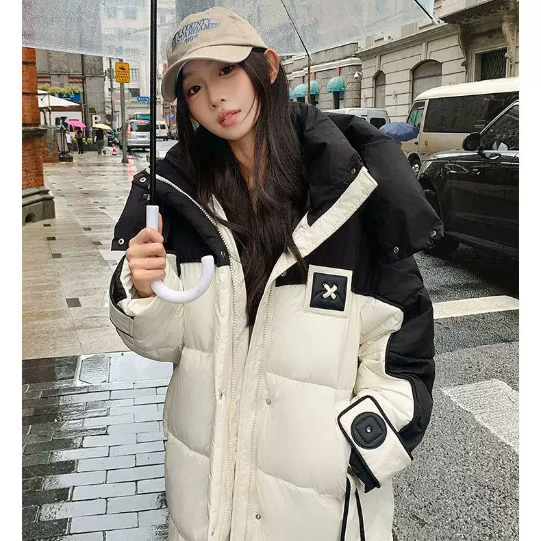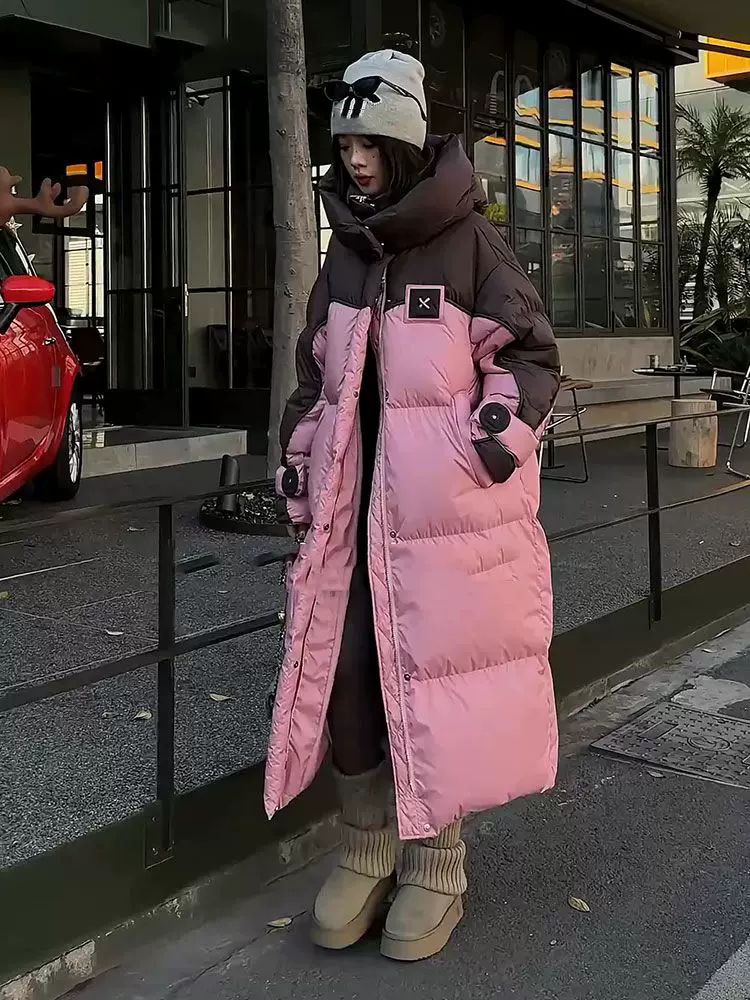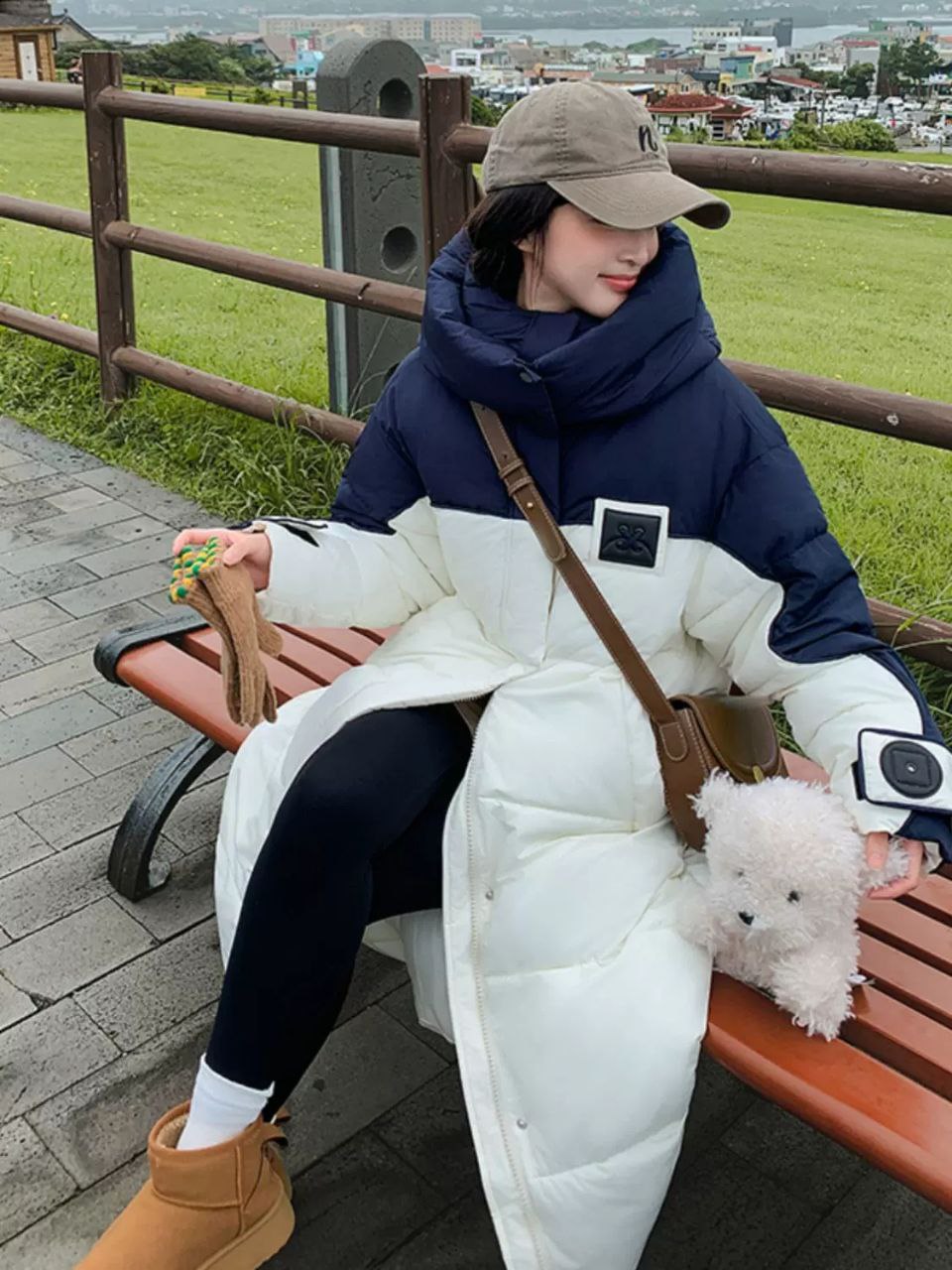 ستة طويلة بطول الركبة، سميكة ومبطنة، مع غطاء للرأس وتصميم فضفاض يناسب المقاسات الكبيرة على الطراز الكوري.