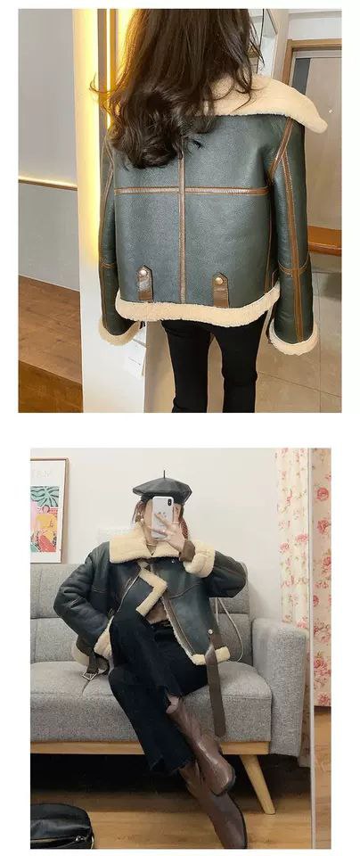 معطف شتوي جديد من الفرو الصناعي باللون الأخضر مع ياقة كبيرة وسحاب أمامي سميك للنساء