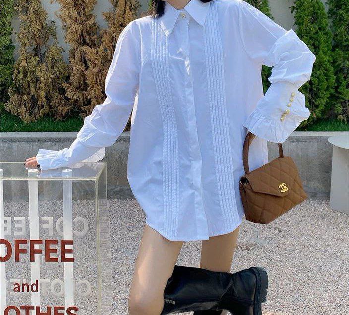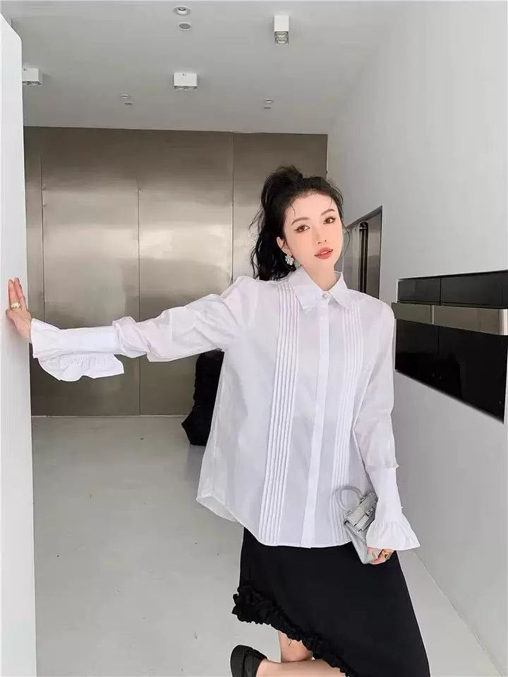قميص نسائي أبيض أنيق بأكمام جرس مطوية مكشكشة