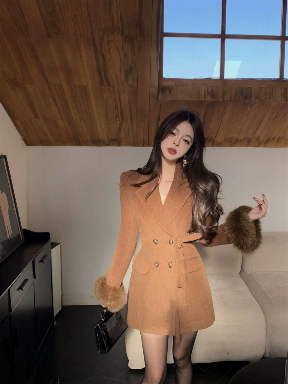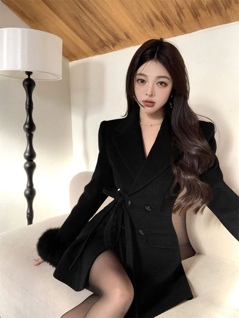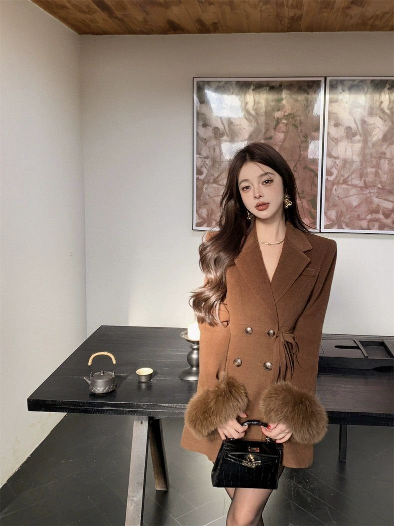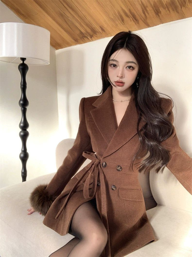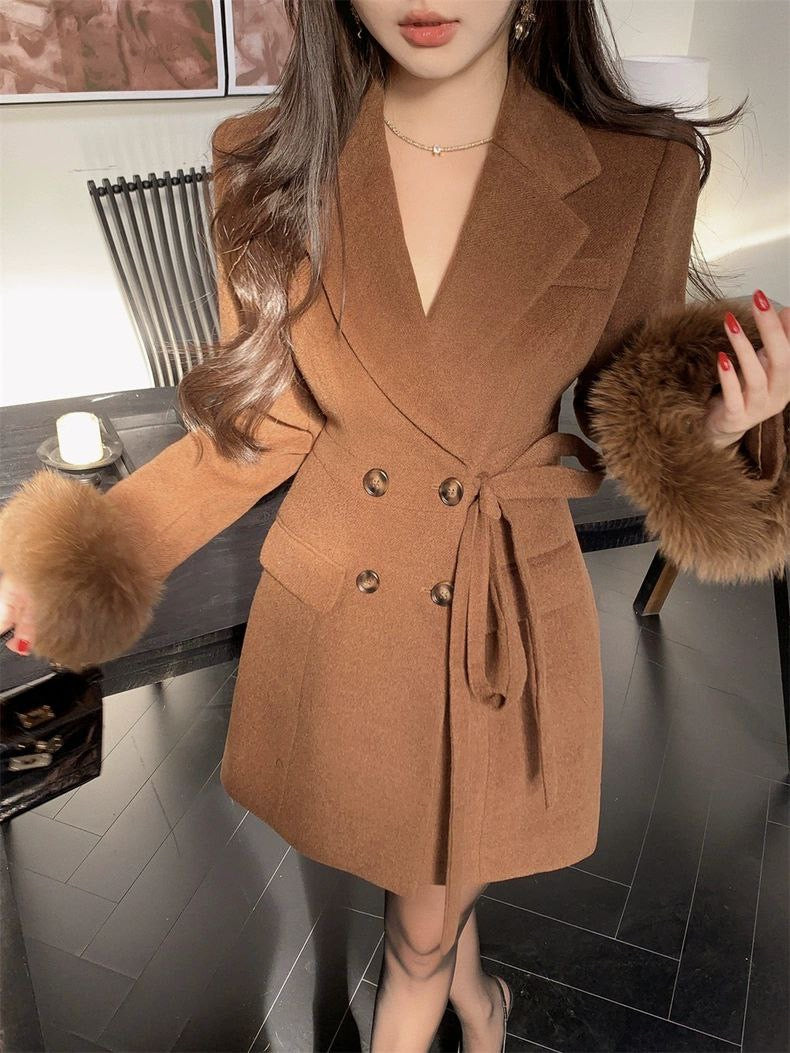 This high-quality wool coat is designed for autumn with a warm padded lining and a double-breasted front. The waist-length cut and adjustable belt offer a flattering slim fit, while the elegant long silhouette adds sophistication to any outfit.