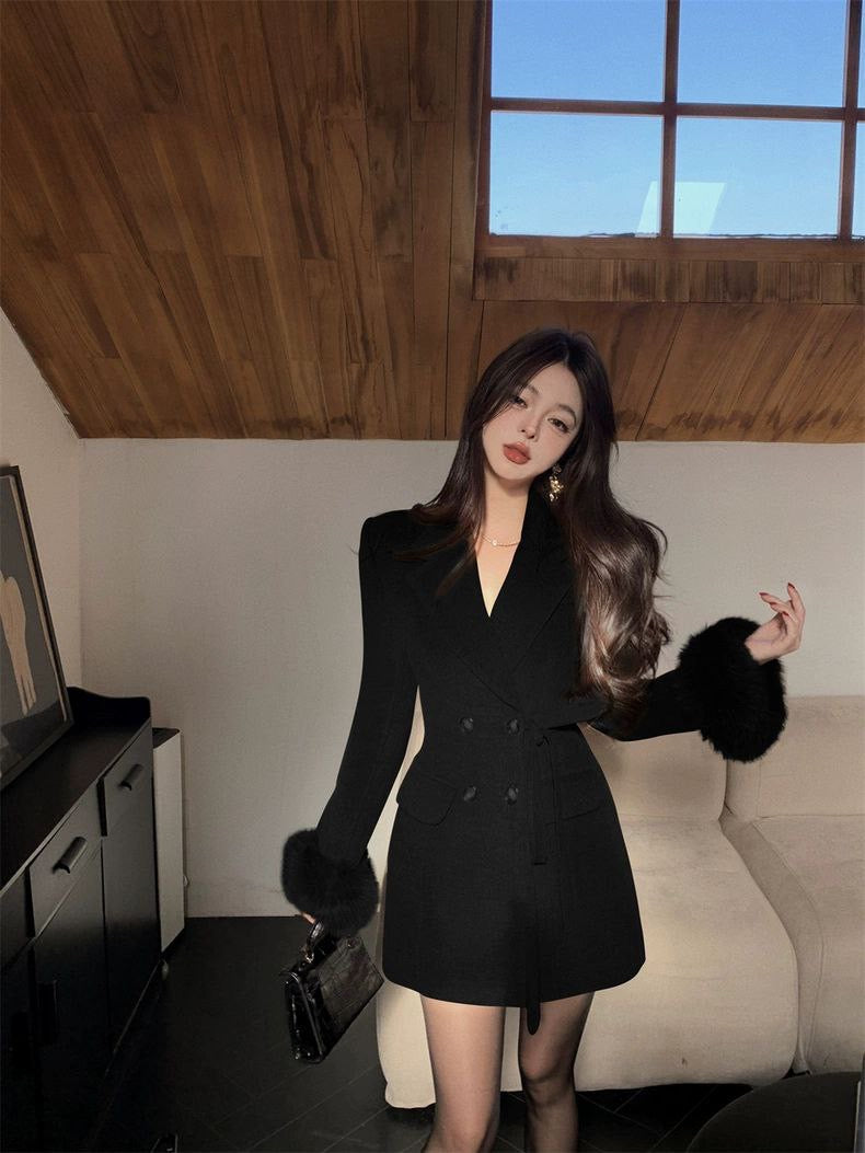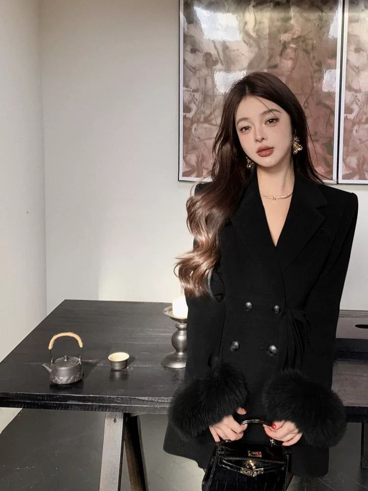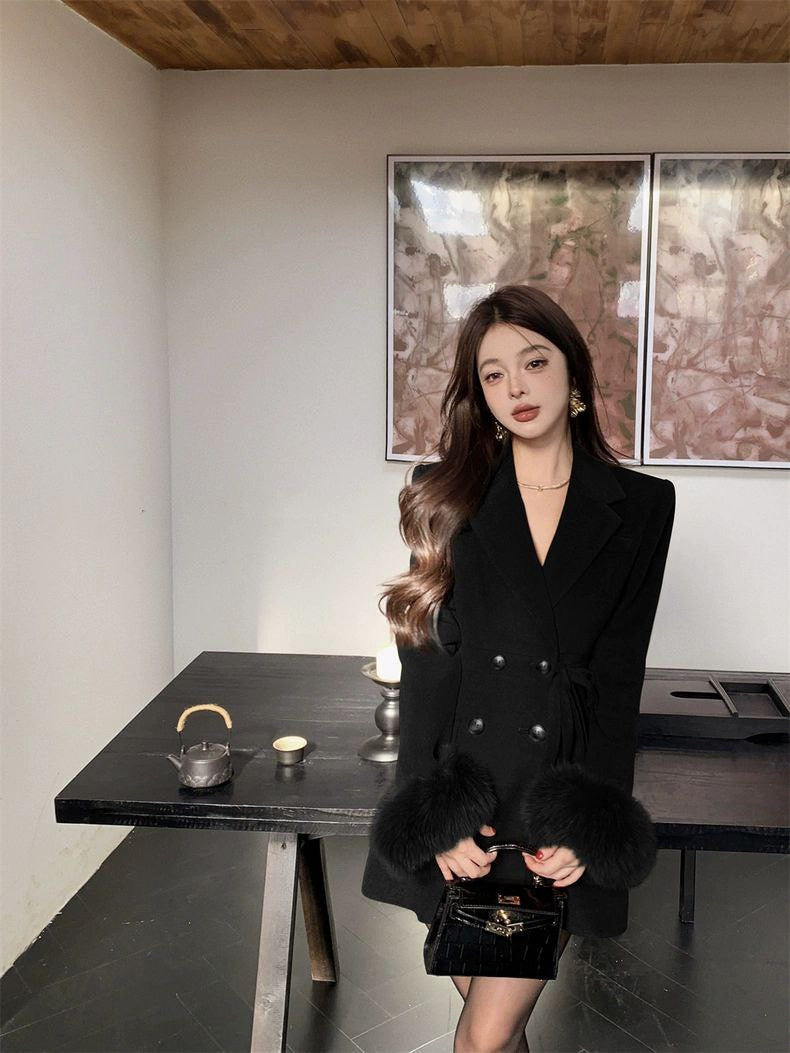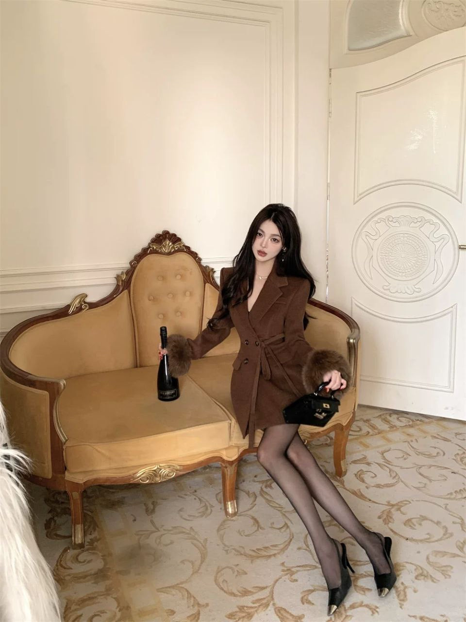This high-quality wool coat is designed for autumn with a warm padded lining and a double-breasted front. The waist-length cut and adjustable belt offer a flattering slim fit, while the elegant long silhouette adds sophistication to any outfit.