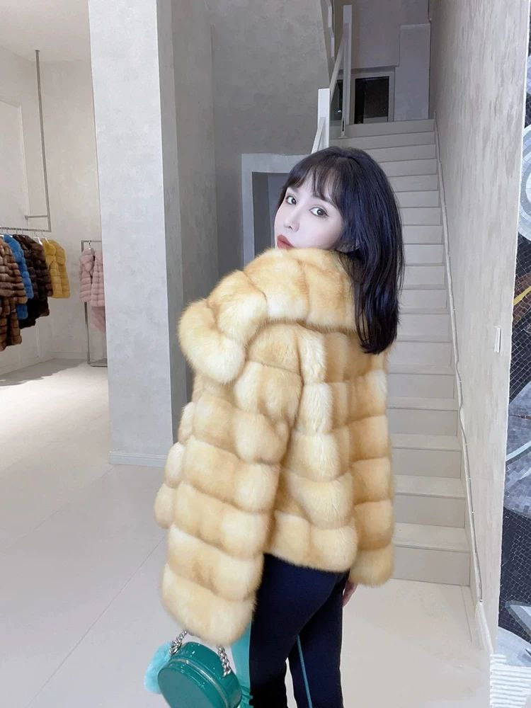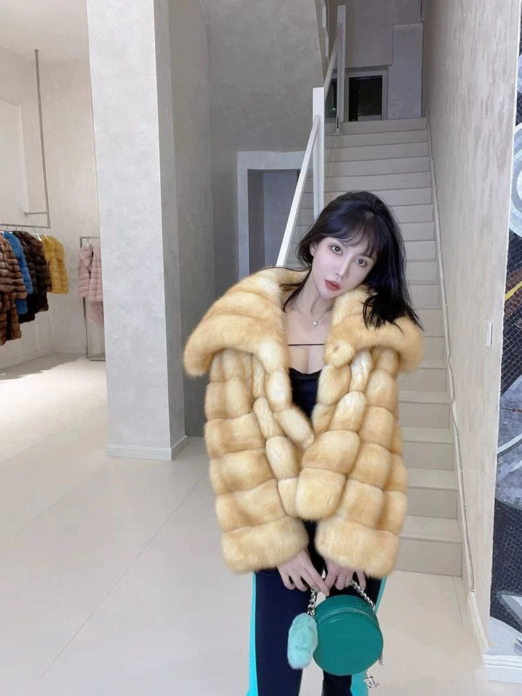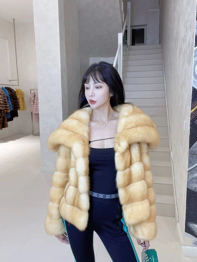 Stylish winter coat made of eco-friendly faux fox fur, featuring a large collar and luxurious sable-inspired look. Youthful and modern design, perfect for cold weather.